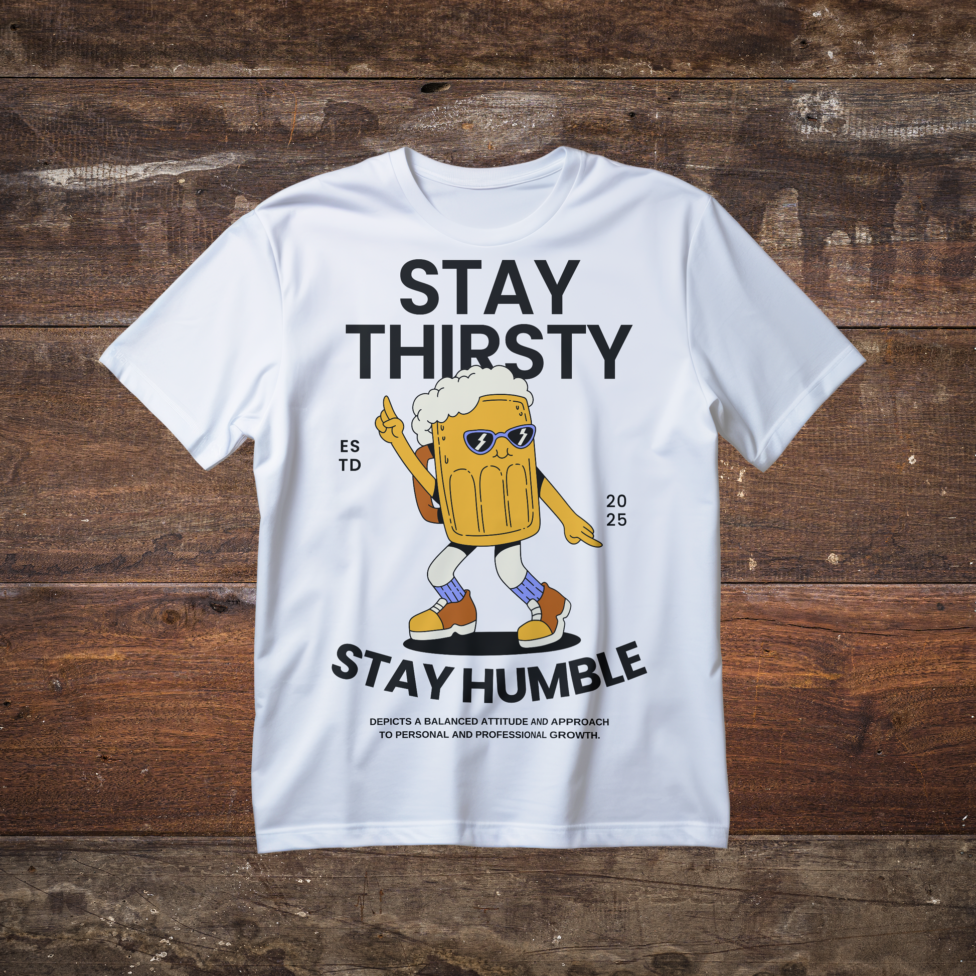 Add a splash of fun and wisdom to your wardrobe with this quirky “Stay Thirsty, Stay Humble” t-shirt! Featuring a funky cartoon beer mug with shades and swag, this tee perfectly balances humor with a motivational vibe. Whether you’re chasing goals or just enjoying good vibes, this shirt reminds you to stay driven and grounded.