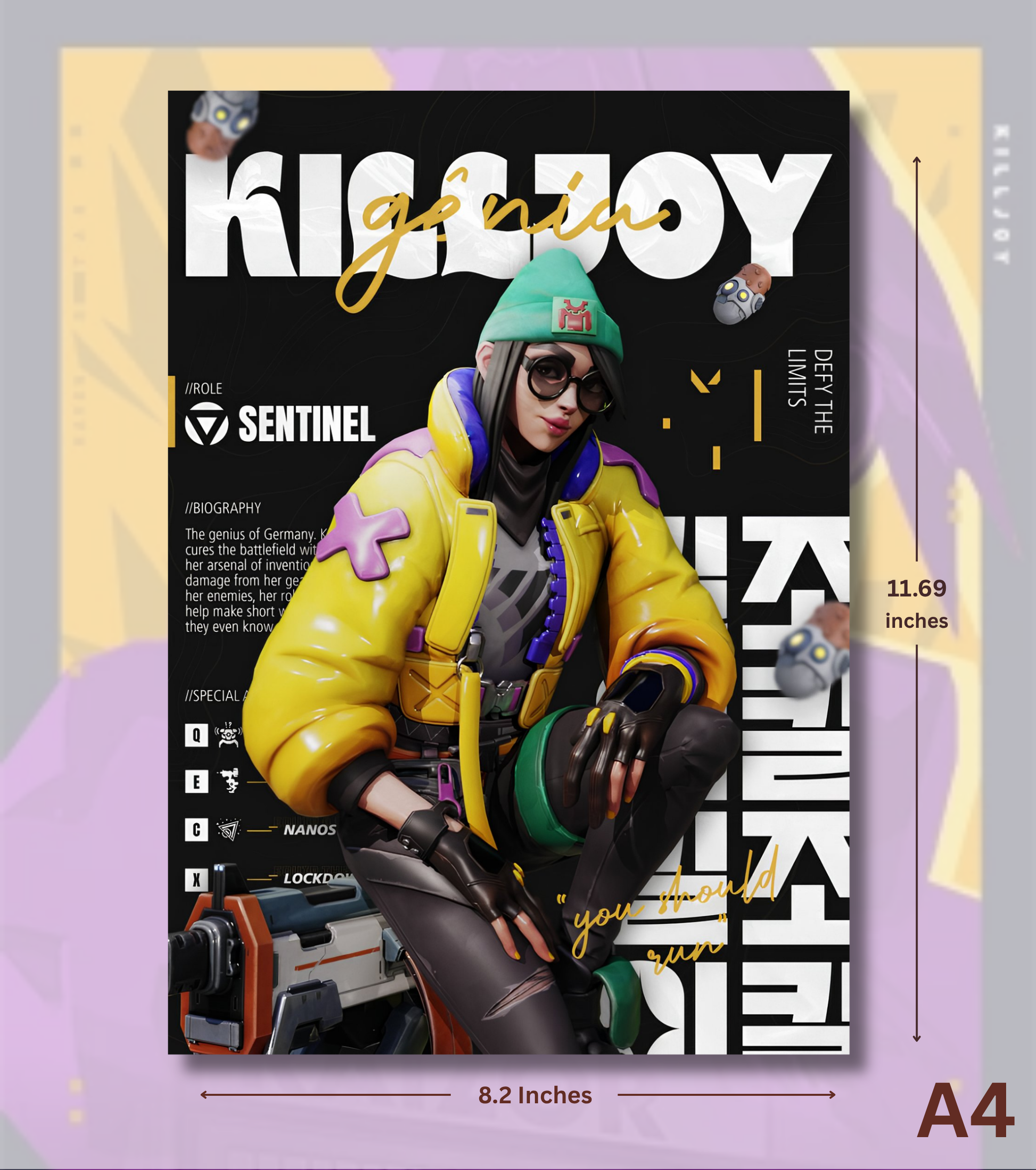 Showcase your tactical side with this Valorant Killjoy – Tech Genius Wall Art. Featuring the German prodigy in her iconic yellow jacket and beanie, this artwork highlights Killjoy’s confidence, intelligence, and inventive dominance on the battlefield. With clean, futuristic design and signature Valorant typography, it’s perfect for fans who love strategy and style. Printed on 300 GSM High Matte Finish paper, it offers stunning color depth and a sleek, modern look.