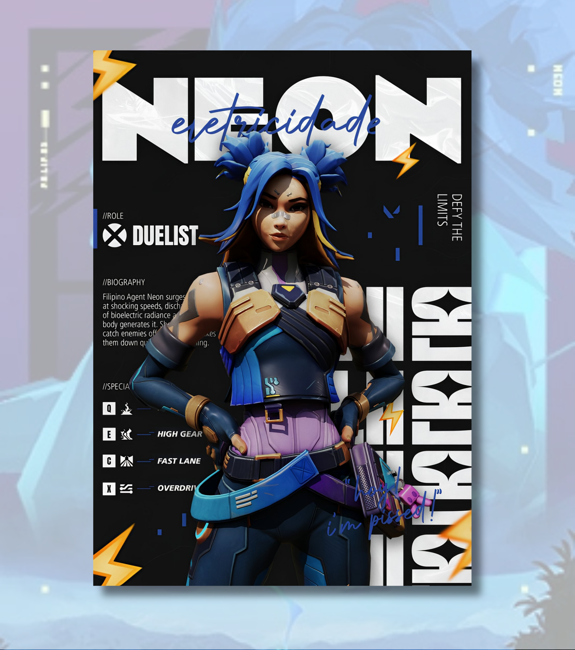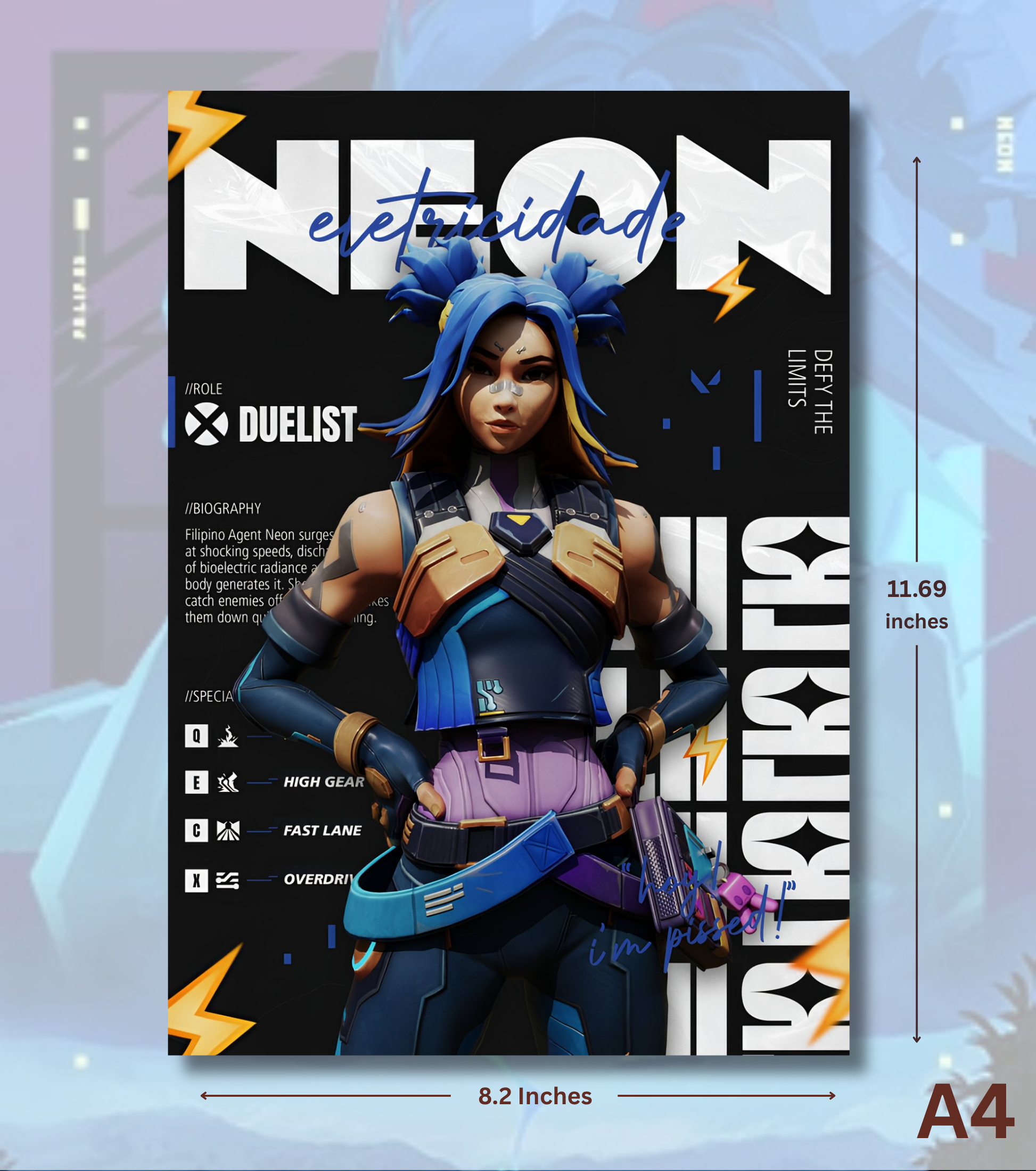 Charge up your space with this Valorant Neon – Electric Speed Wall Art, featuring the lightning-fast duelist in all her electrifying energy. With bold typography and striking blue-yellow accents, this piece captures Neon’s unmatched agility and power. It’s the perfect visual for those who play fast, hit hard, and never back down. Printed on 300 GSM High Matte Finish paper, it delivers crisp detail and a smooth, premium finish that glows with energy.